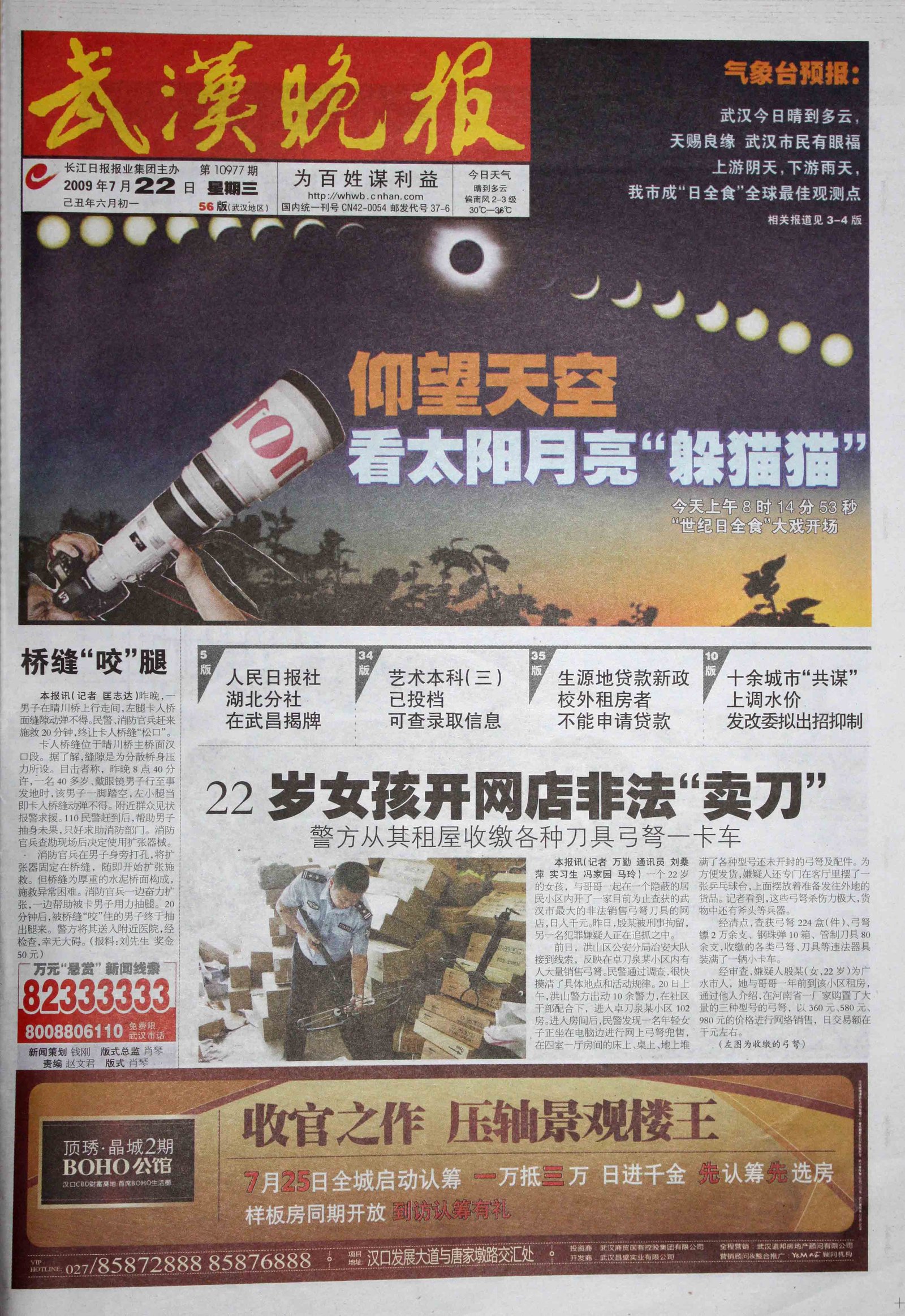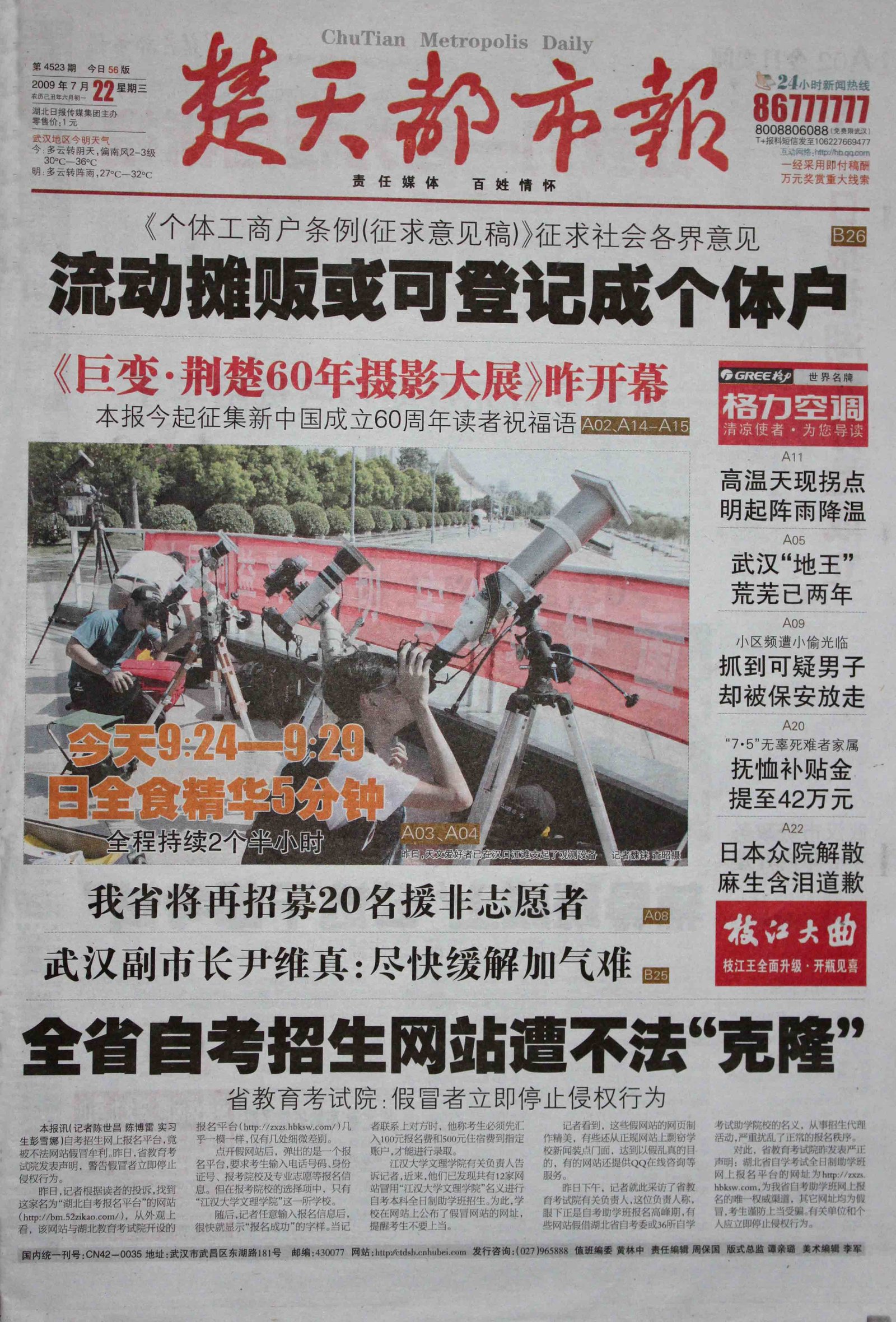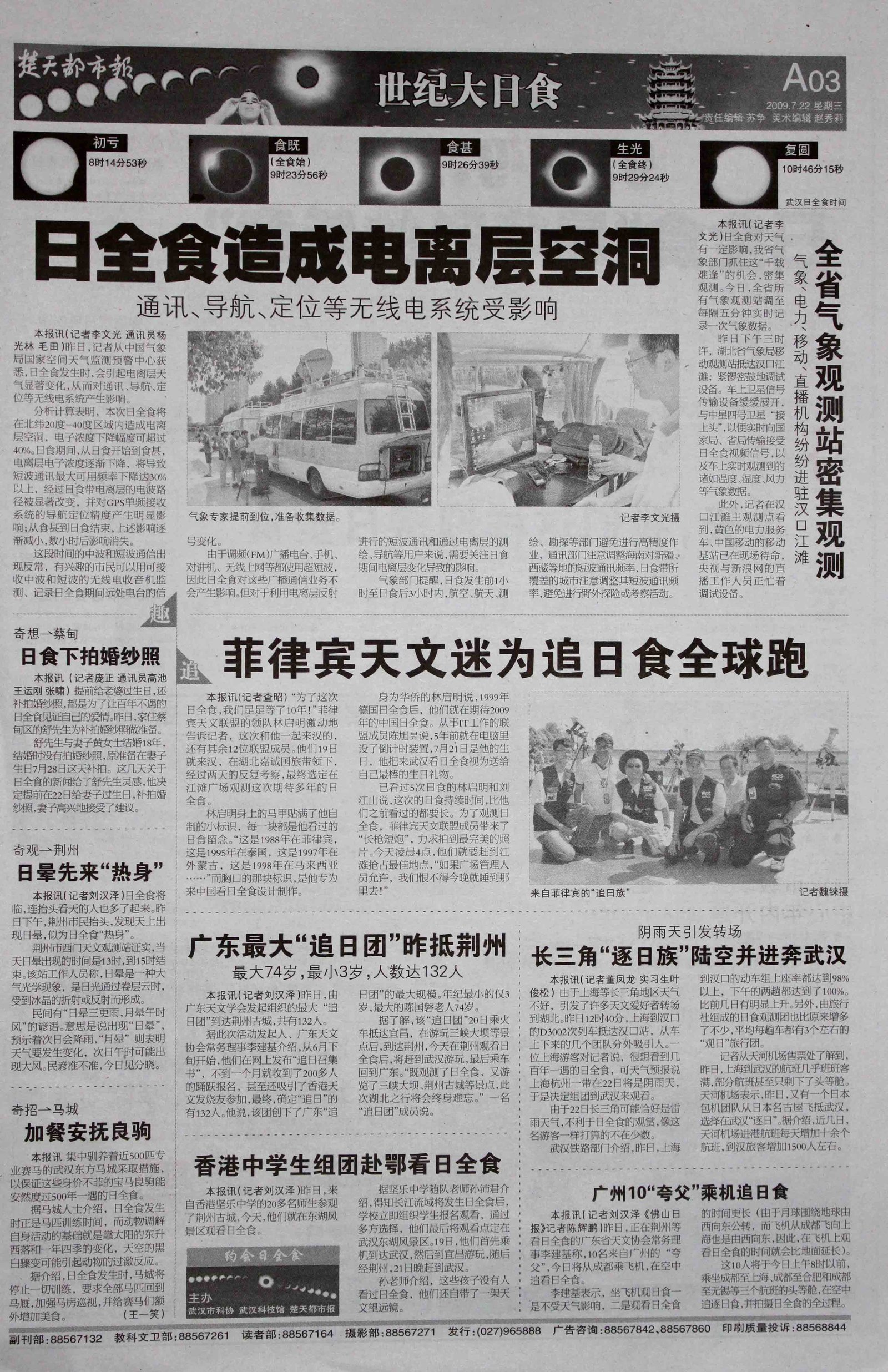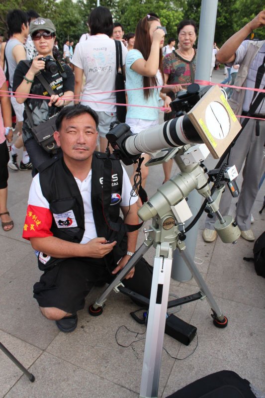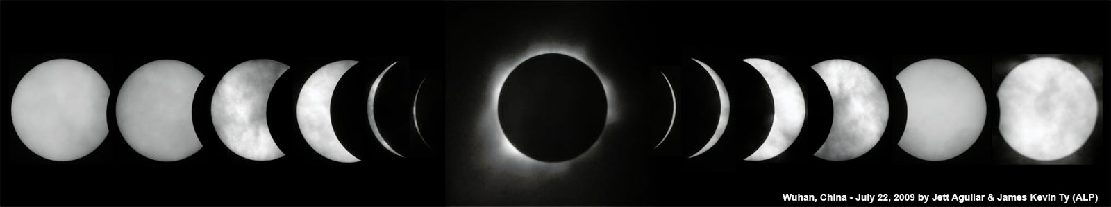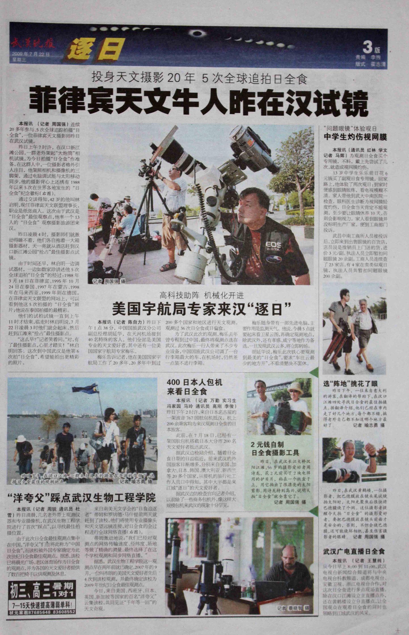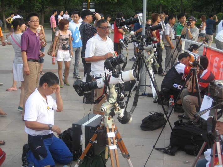 The group were able to arrive at Jiangtan Park at around 4:00am but the gate was still closed but there were already a lot of people already ready to enter the park to get the best observing position at the park. James was already anticipating the scenario yesterday and disagree with Zed that it was too early for them to be there at 4:00am. true enough, the decision to be as early as possible to the site was correct and Zed later told James he did made the right decision to be there early. While they were waiting for the gate to open, James and Jun had asked the other members of the Wuhan team who doesn't have heavy luggage to run for the team's observing site and secure it for the group because most of the research team's luggage are big and heavy :( After securing the observing site of the ALP Wuhan TSE team, they started to setup their equipment as son as they laid down their equipment. The sky that morning was a bit cloudy but no rains. The group observe the cloud pattern and movement and was also able to see Venus in the eastern horizon amid the scattered clouds. When the Sun rose from the eastern horizon, it also carries a beautiful 22 deg Sun Halo. They are form when light from the sun or moon is refracted by ice crystals associated with thin, high-level clouds (like cirrus stratus clouds.)).At a point in time, a faint display of a 46-degree halo was faintly visible as well, at the latter part of the morning. But one thing not good about seeing a Sun Halo is that the weather is not perfect and might spell bad weather for Wuhan viewers :( Nevertheless, the team was still hopeful that it wont affect the weather too much later specially during the crucial totality time :0 The ALP Wuhan TSE team brought along an assortment of astro equipment as well as still and video imaging systems to the trip. Team Leader James Kevin Ty brought along a full frame Canon 5D Mark 2 DSLR on a Canon EF 100-400mm f/4.5~5.6 IS lens with EF II 2x converter giving effective focal length of 800mm f/11 with ISO 800 and mounted on a Vixen GP-DX equatorial mount with Starbook-S controller tracking the Sun beautifully and accurately centered on th middle of the frame. A Canon FS11 videocam as well as a digital 8 videocam was also installed on the mount to capture the eclipse in real time. He also has a Canon EF 15mm f/2.8 180 deg fisheye lens installed with the Canon 5D Mark 2 DSLR to capture the horizon "sunset glow" effect during totality. Another Canon 300D DSLR with EFS 18-55mm f/3.5~5.6 lens set at 18mm to capture diminishing light on the entire eclipse sequence. This was later handed over to Jaime Quinto to handle. ALPer Jett has a Canon 50D DSLR mounted to a Borg 77ED II refractor on a Takahashi Space Boy equatorial mount. Another Canon 350D was also installed with a Canon EFS 10-22mm f/3.5~4.5 ultra wide lens to try also to capture the horizon glow appearance during totality. An HD videocam was also installed on Jett's mount to capture the flash spectrum during second and third contact diamond rings. ALPer Jun Lao ,on the other hand has an Opteka 500mm f/6.3 Maksutov mirror lens on a DSLR on sturdy tripod while another Canon compact point and shoot camera with standard video set to capture the rapidly moving shadow bands (since it was a bit cloudy, shadow bands was hard to see even with the naked eye and in light of this, last minute change of plans shifted the camera to shoot the sky with the Sun centered in the frame a few seconds before totality begins to see the how dark the sky was. He also have a HD videocam also mounted on a sturdy tripod to capture the surroundings as well as the crowd reactions during totality. This was later handed over to ALPer Johnny Quinto to lessen his work load. ALPer Andrew Ian Chan , on the other hand, brought along a Skywatcher 80ED refractor with a 10mp DSLR mounted on an EQ-1 equatorial mount. Zed brought along a Canon 30D DSLR with a 300mm f/4 lens with 1.7x teleconverter as well as another 300mm f/4 lens and wide angle 28mm lens on 2 film based SLR cameras. All 3 cameras are mounted on top of a sturdy Manfrotto mount with horizontal bar with heavy duty ball socket heads. 2 digital thermometer/hydrometer units were handed over to Jaime and Joanna Quinto to measure temperature and humidity during entire eclipse time. The rest of the team members just wanted to enjoy and experience the eclipse without fumbling on equipment. This is also a good decision specially for first time total eclipse observer to get a feel of the event without the pressure of gluing their eyes on a camera and missing the beauty of totality :) The group has an adequate amount of total eclipse experience leading the group. ALP Wuhan team leader James Kevin Ty and ALPha Editor in Chief Francisco Lao, Jr. both has 4 total solar and 1 annular eclipse experience tucked on their belts while guest Zed has 1 total solar eclipse experience. The rest of the group are first time total eclipse chasers. As time passed, more and more people are arriving at the site and by the time it was around 8:00am, the park was almost jam packed with people eagerly awaiting first contact which was estimated to be at around 8:14:55am. Mr Chou Guo Qiang of Wuhan Evening Post showed the group they were featured again in their newspaper as well as in Chu Tian Metropolis Daily and this got the group all smiles as well as happy :) LOL ALP Wuhan TSE team is treated as almos like a celebrity with lots At around 8:15am, James was able to detect a subtle nip at around 2-3 O'clock position and started to shout in English as well as Mandarin to inform fellow ALPers as well as onlookers that first contact has already transpired. during that time, clouds are getting a bit thicker but they can still see the eclipsed Sun though the clouds openings. As the eclipse progresses more clouds started to come in and out of where the Sun was located and this worries the group. As totality time comes nearer and nearer, more crowds poured in at the 