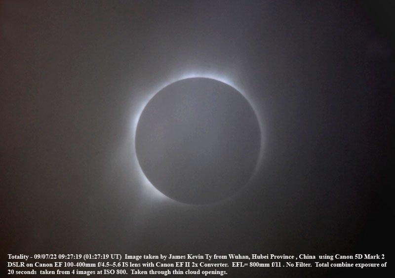The horizon was light yellow orange in color and they could hear cicadas chirping during totality. Multiple camera flashes can be seen on the stills and video from the crowds below the observing site. It looks like the Sun was the star of the concert with lot of people howling and cheering for the Sun to come out of the clouds. The atmosphere was tense and exciting indeed! After maximum totality, James got to see some breaks in the thick clouds and totality can be seen coming in and out of the this clouds. So James and Jett with the advantage of having an equatorial tracking platform got to image the totality as it comes in and out of the clouds while the rest of the members just opted to see the totality with their naked eyes as well as try to image the totality with their cameras but unfortunately, the totality was dimmed severely by the clouds thus longer exposure was needed thus only James and Jett that has some good results to capture the inner corona.